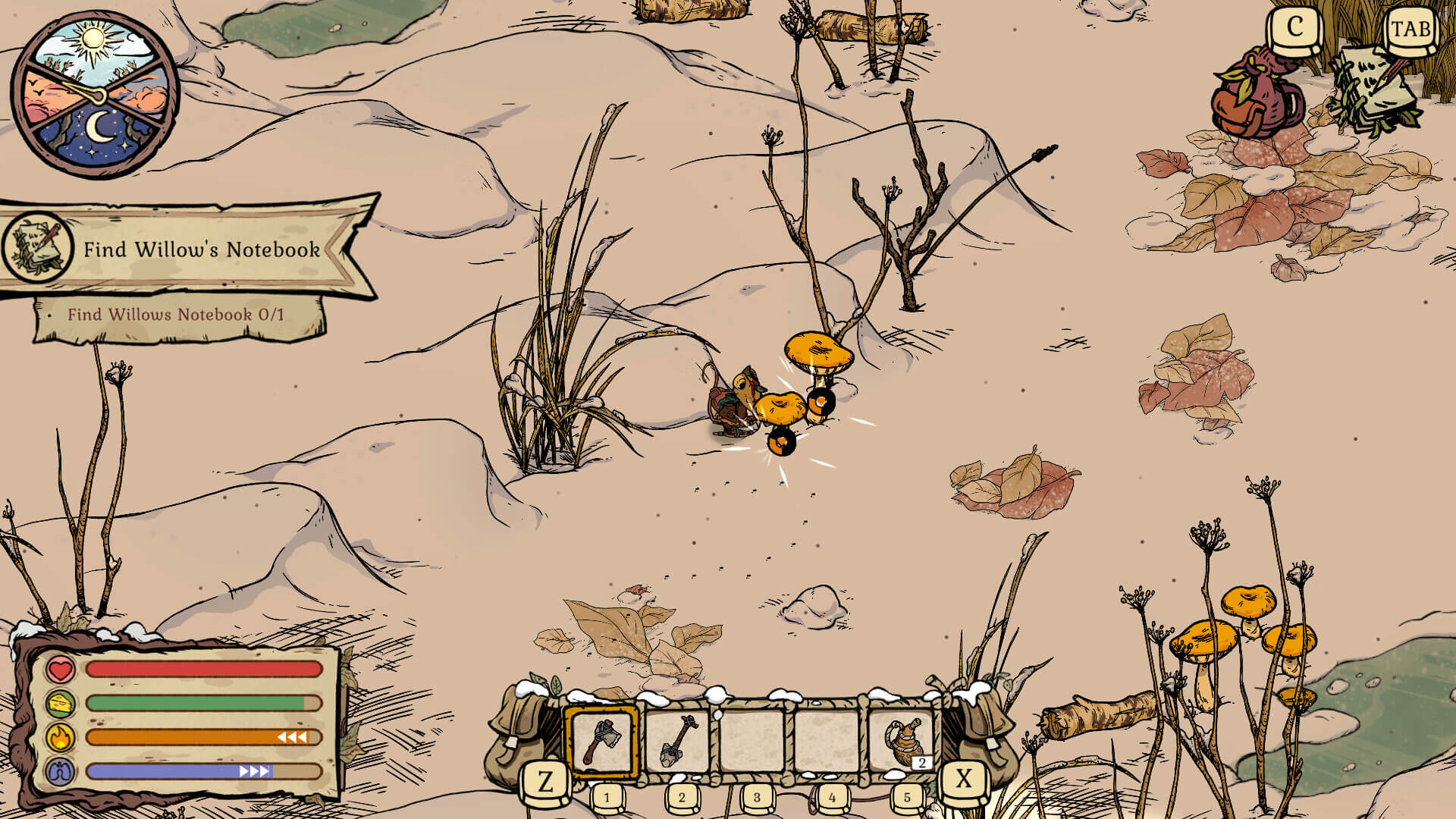En Winter Burrow tendremos que prestar atención a nuestras necesidades básicas. El hambre y el frío serán nuestros mayores enemigos, siendo un fiel reflejo de las necesidades básicas de cualquier ser vivo en el mundo real. También tiene un indicador de resistencia, por lo que nuestro ratoncito no podrá hacer toda clase de tareas sin descanso. Tendremos que aprender a gestionar nuestro tiempo y esfuerzo en función de nuestra situación y nuestros recursos.