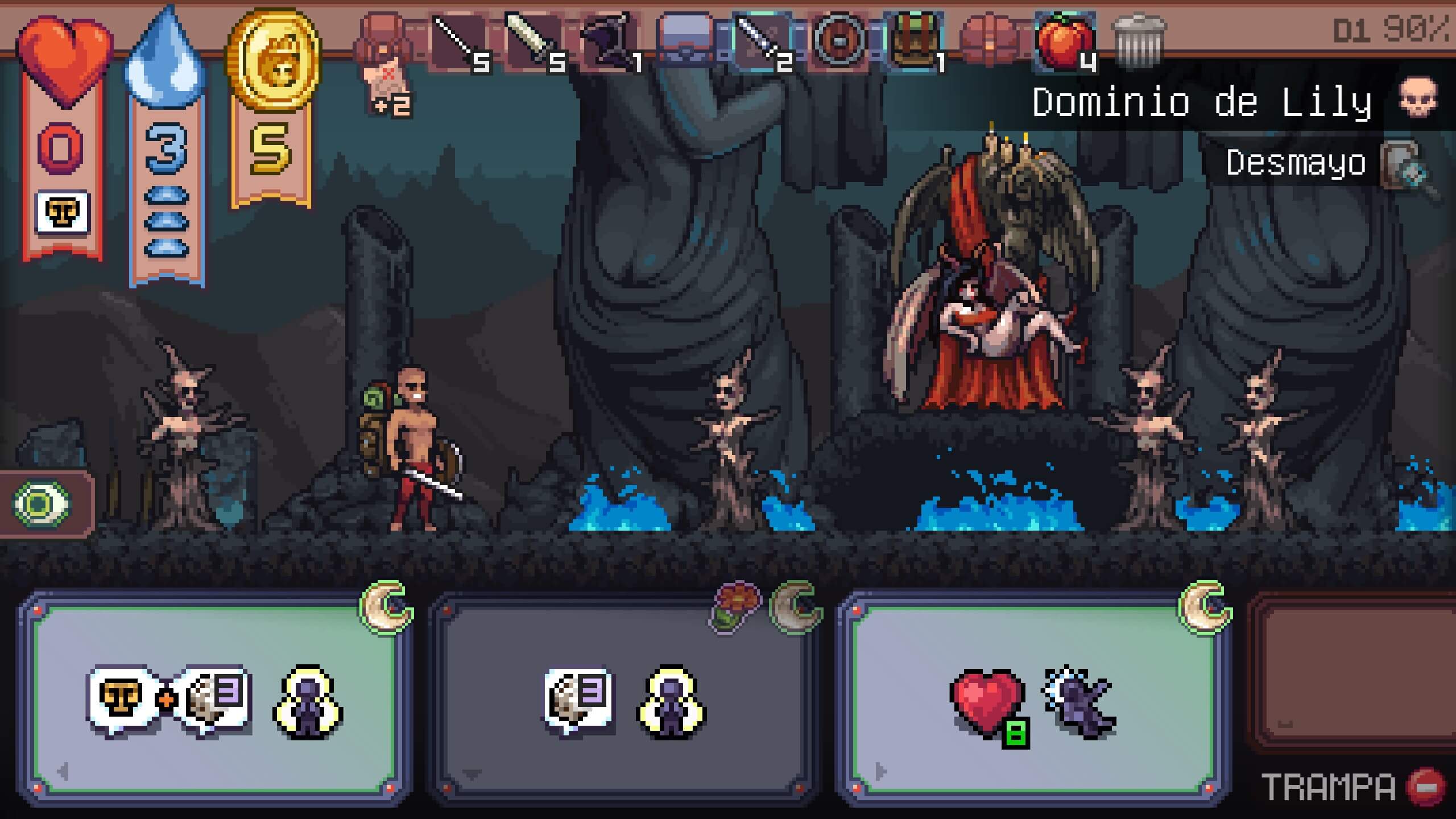 Las cartas se presentan de cinco en cinco y nuestro progreso dependerá de cómo las resolvemos. Si nos quedamos sin cartas sin haber avanzado lo suficiente, se acaba la run y a otra cosa, mariposa. A veces incluso sin saber qué ha pasado. A mí me ocurrió. Es más, en más de una ocasión no entendí por qué una acción era lo mismo que cometer un pecado debido a que los resultados visuales o textuales no estaban claros.