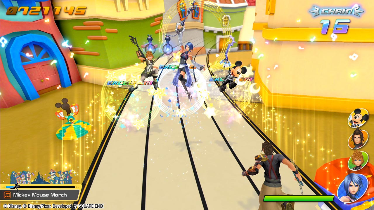 Eso sí, aquí tendremos dos nuevas notas a las que estar atentos. La amarilla nos hará mover el joystick (da igual si el derecho o el izquierdo) hacia la dirección que marquen las flechas. Con la verde tendremos que mantener el botón pulsado hasta el final, donde deberemos pulsar otro botón para finalizar el combo correctamente. Estos niveles se dan, entre otros, en todos los mundos de Kingdom Hearts 3, no pudiendo disfrutar en ninguna parte de esta sección de niveles estándar.