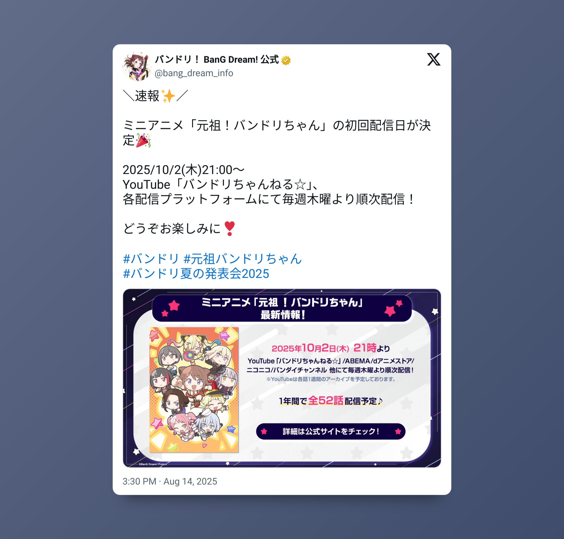Además de la película, la franquicia sigue creciendo con proyectos como Ganso! Bandori-chan, una miniserie de 52 episodios que se estrenará en octubre de 2025. Este nuevo proyecto, dirigido por Kenshiro Morii y Seiya Miyajima, promete un enfoque más ligero y divertido, perfecto para complementar las historias más intensas de Ave Mujica. Con una base de fans tan diversa, BanG Dream! continúa consolidándose como un referente en el mundo del anime musical.