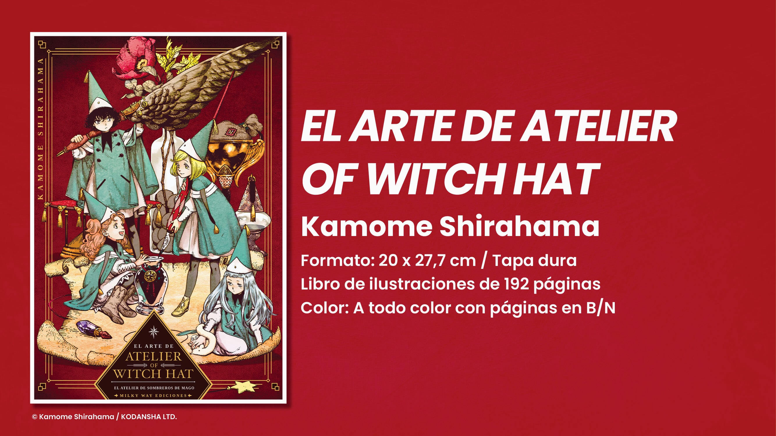 El arte de Atelier of Witch Hat es una pieza de coleccionismo imprescindible para cualquier fan de la serie. Se trata de un libro de arte presentado en tapa dura de gran formato que te sumergirá una vez más en la mágica y maravillosa atmósfera de la obra. En sus casi 200 páginas, la inmensa mayoría a todo color, se recopilan ilustraciones del manga y de la revista Morning Two, donde se serializa la serie, material proveniente de las ediciones especiales y multitud de dibujos creados por Kamome Shirahama para sus redes sociales. Una oportunidad única para disfrutar de las espectaculares imágenes de Atelier of Witch Hat a tamaño grande y descubrir nuevas facetas de los personajes de esta historia plagada de magia y acción.