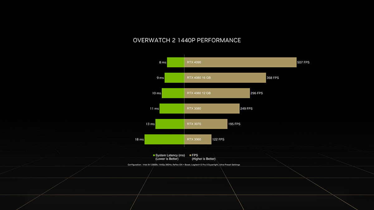 NVIDIA también ha resaltado el rendimiento de las nuevas GeForce RTX 40 Series en Overwatch 2. Las últimas tarjetas gráficas de NVIDIA son tan rápidas que Blizzard ha tenido que aumentar la tasa de cuadros máxima de 400 a 600 FPS. Además, las nuevas GPU reducen la latencia hasta a 8 milisegundos, con tasas de refresco superiores a los 500 FPS a 1440p de resolución.
